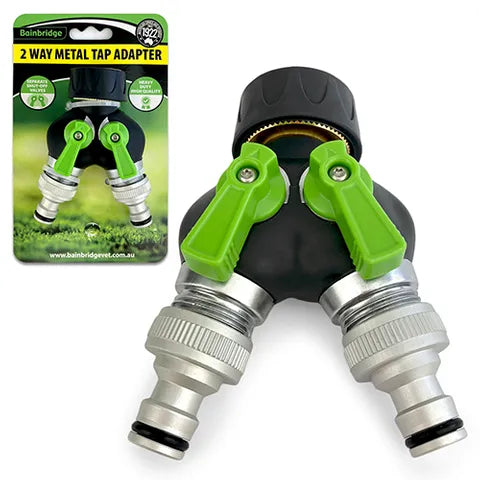 - Our 2 Way Metal Tap Adapter will solve that issue! Immediately turn one tap into two by simply attaching this to any standard outdoor tap. With its durable and long-lasting design, our 2 Way Metal Tap Adapter will be a worthwhile investment.